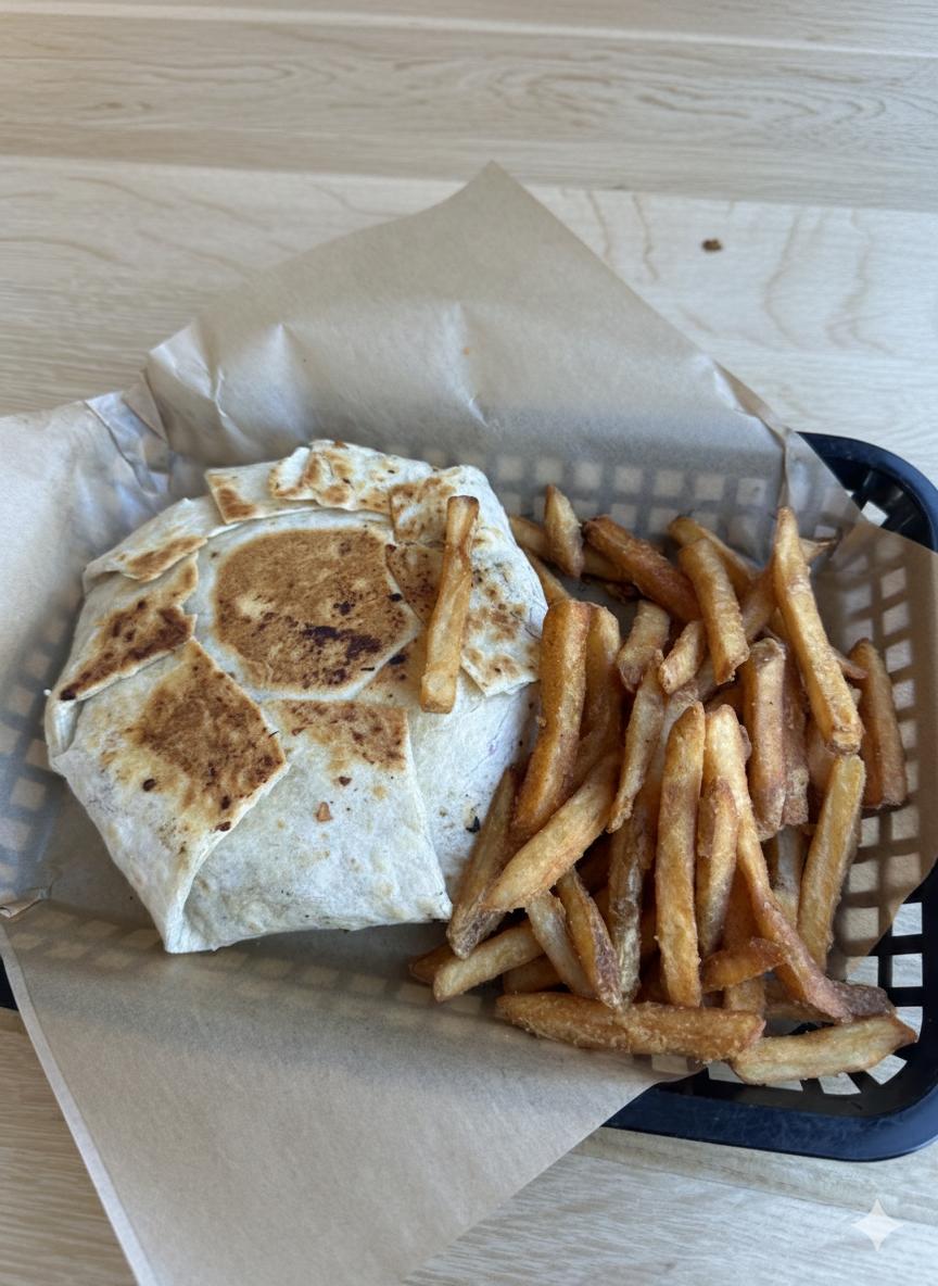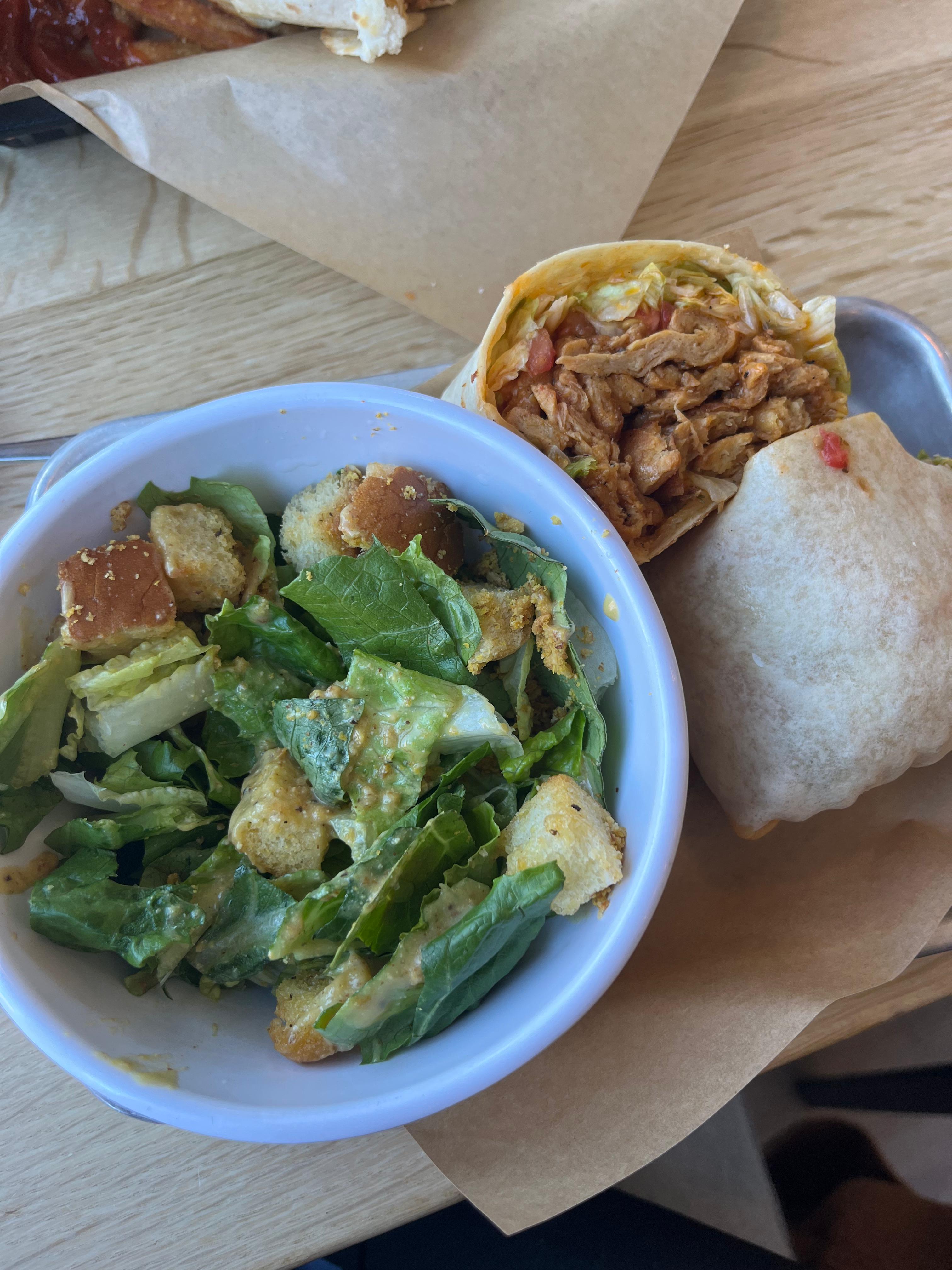 The crunch wrap was crispy, loaded, and honestly better than the fast food version it's inspired by. The buffalo chicken wrap had the perfect amount of heat, and the Caesar salad was fresh with a creamy dressing and big crunchy croutons.